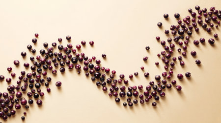 A stunning display of red and black berries arranged to create a flowing wave on a beige surface. Ideal for use in culinary photography, food blogs, or design projects.