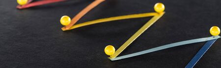 panoramic shot of multicolored abstract connected lines with pins on black background, connection and communication concept