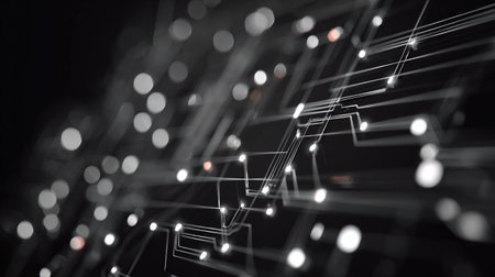 Explore a captivating abstract background featuring circuit lines and luminous dots, symbolizing data connectivity and digital innovation in a sleek, futuristic setting.