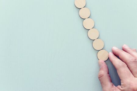 image of tangram blocks with people icons over wooden table ,human resources and management concept