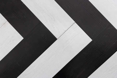 top view of black and white painted wooden herringbone floor background texture, Looks like direction arrow symbol.