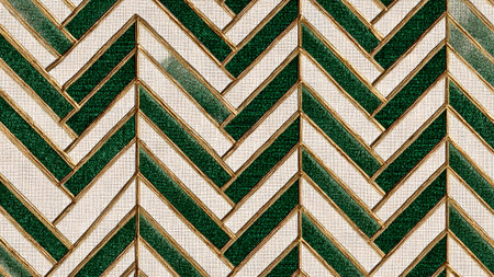 Detailed chevron pattern with alternating green and beige stripes, accented with gold lines. Ideal for backgrounds.