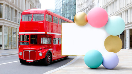 Iconic red double-decker bus is positioned on urban street, framed by contemporary buildings and vibrant geometric shapes, providing ample copy space for design use