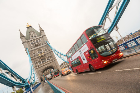 LONDON, UNITED KINGDOM - NOVEMBER 01, 2013: Famous Double-Decker Red Bus on Tower Bridge on a cloudy day