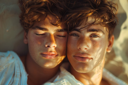 A tender embrace between two young men in soft lighting.