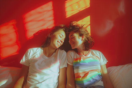 An intimate moment unfolds between two female lovers as they embrace on a red bed within a minimalist bedroom setting Image captures their deep affection and connection