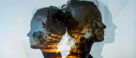 Environmental awareness. Double exposure portrait of two women in profile and trees in foggy forest.