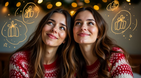 Two women wearing matching Christmas sweaters sit close together, smiling joyfully. They are surrounded by twinkling lights and whimsical illustrations of presents, creating a festive atmosphere.