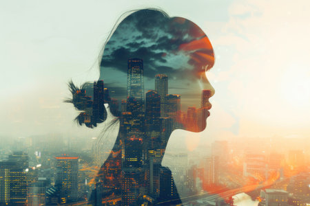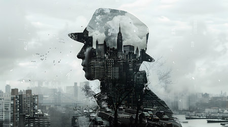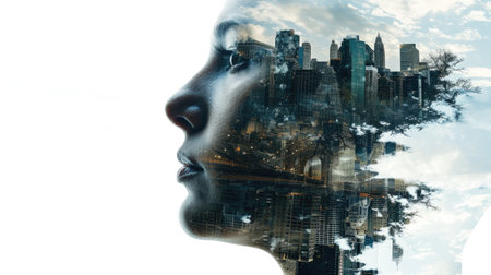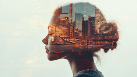 Double exposure of a womans profile and a detailed cityscape, evoking a dreamlike urban vision