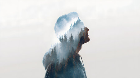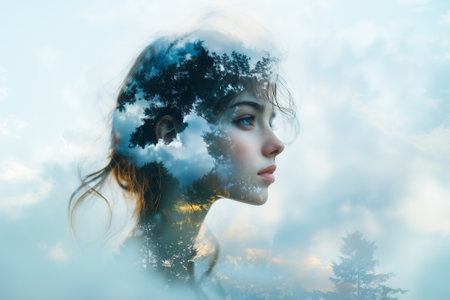 Double exposure of a person and nature, the sky and trees merging into a peaceful scene