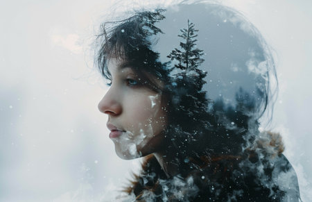 A double exposure showing a womans face superimposed with a mountainous landscape in the background. The womans features blend seamlessly with the rugged outlines of the mountains.