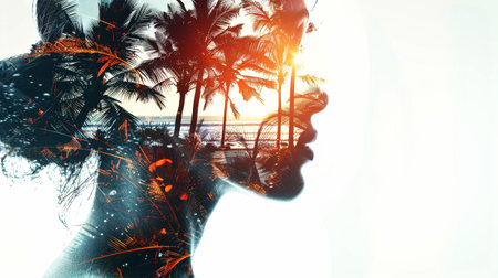 A womans profile is silhouetted against a white background, with palm trees and a sunset overlayed in a dreamy, layered effect.