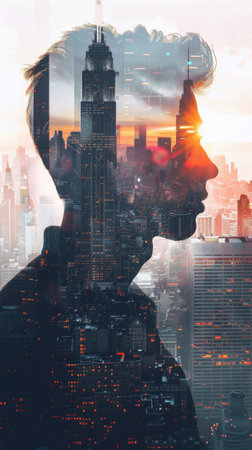 Artistic double exposure of a businessperson and cityscape symbolizing vision and growth
