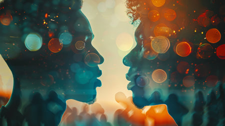 Two silhouettes with a floral double exposure, symbolizing love and connection in a vibrant spring setting The image captures emotions of intimacy and nature