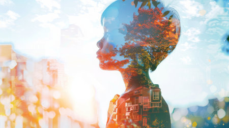 Creative double exposure image featuring woman profile blended with city skyline, showcasing harmonious connection between nature and urban life. contrast of black and white enhances emotional