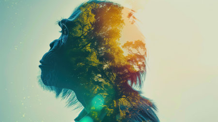 A close-up profile portrait of a chimpanzee against a pale sky. The subjects face is in focus, while the background is blurred. The chimpanzees silhouette is overlaid with a double exposure of a tree, creating a visual representation of the connection between humans and nature. The image captures a sense of wonder and awe, reflecting on our relationship with the natural world.