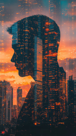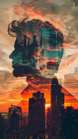 This image shows the profile of a man with a cityscape silhouette superimposed over his face. The cityscape appears to be at sunset, with a warm orange and red color scheme. The man is facing to the right of the frame, and he is wearing a dark jacket.