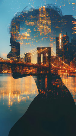 A woman's profile blends with a vibrant city skyline illuminated at twilight. The Brooklyn Bridge is visible, reflecting on the calm waters, embodying a dreamlike atmosphere.