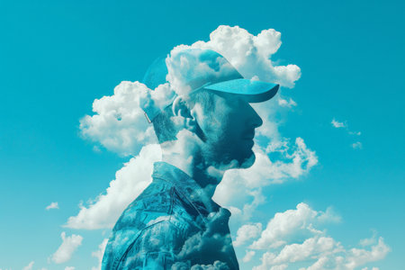 Man in cap double exposure against blue sky with clouds in background creating artistic and dreamy effect