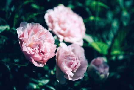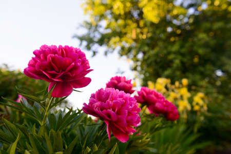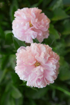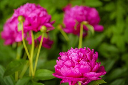 Pink beautiful peonies blooming in the garden.