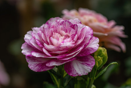 Pink and Green Pon Pon Ranunculus on the background of defocused garden with copy space for text or design