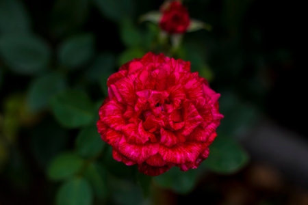 The Red rose flower blooming in roses garden on background green foliage.