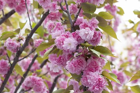 Beautiful blooming sakura flowers on tree branch close up. Sakura pink flowers and fresh green leaves in sunny light in spring city street. Copy space