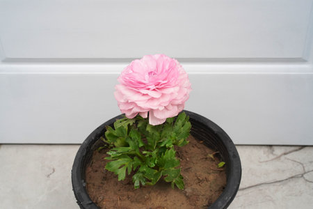 Pink buttercup flower in a pot. Ranunculus asiaticus is covered in water drops and isolated in black pot against the white background. Close-up, high angle view, horizontal