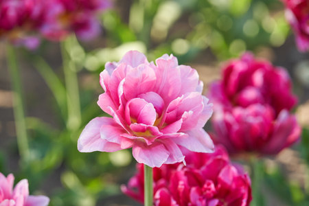 Vibrant Blooming Pink Tulips in a Sunlit Spring Garden.