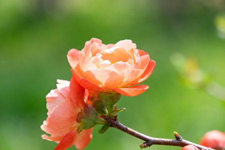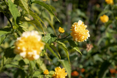 A bush with Kerria japonica flowers growing macro photo with aperture