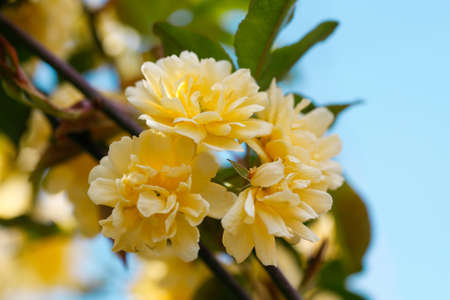 Banksia rose blossoms. Rosaceae evergreen vine shrub native to Japan. High quality photo