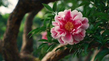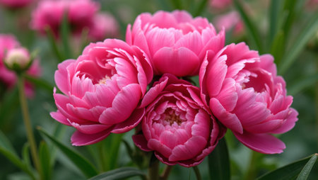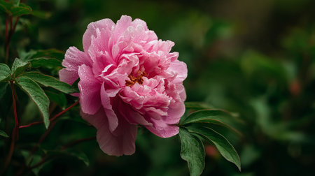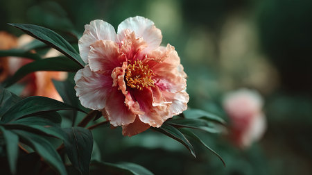 Beautiful peonies flower background with green leaves in garden. Nature scenic wallpaper