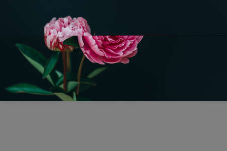 Beautiful pink peonies on a dark background. Place for text.
