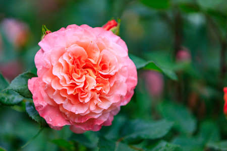Flower bed with a rose in an urban environment. Background with selective focus and copy space for text