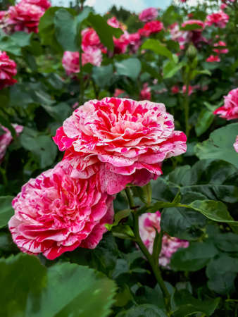 Rose bushes in the city park. Variety of rose varieties and colors. Suitable for postcards and puzzles. Beautiful flowers