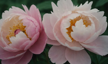 two pink peony flowers. Macro image of two big Bud lush pink peony flower