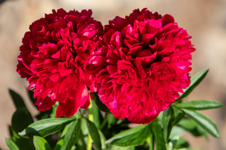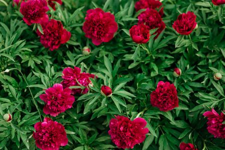 Beautiful and pretty red peonies blooming in the garden.