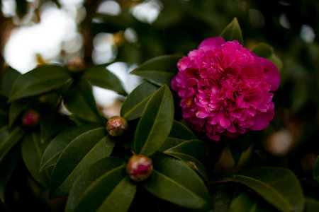 Camellia bush with red blossoms and dark green leaves in the London park