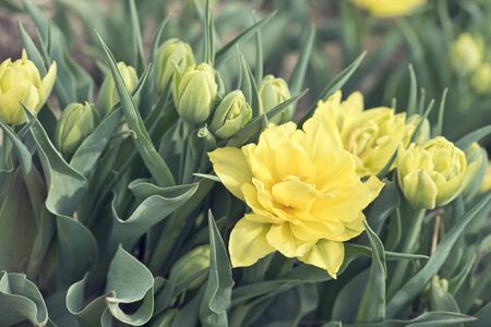 Yellow Tulip flowers meadow, selective focus. Spring nature background