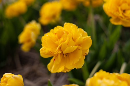 Bright yellow tulips showcase their stunning petals, adding charm and color to the flowerbed, enriching the landscape in Holland.