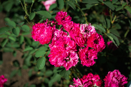 Top view of blooming pink modern shrub roses in a summer garden, showing lush petals, vibrant colors, and natural floral beauty.