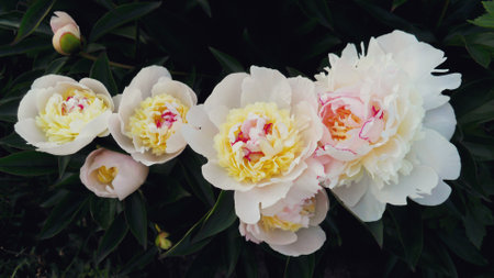 beautiful blooming white-pink peonies with a yellow center. retro photo stylization