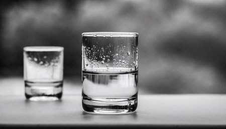 A minimalist photograph featuring two glasses of water on a reflective surface, showcasing clarity and simplicity in a calm and elegant setting.
