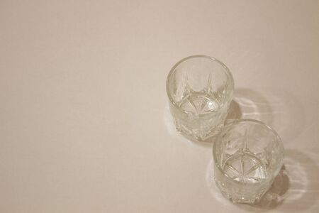 Glass glass with clean water on a light background with hard light and reflection. Flat lay