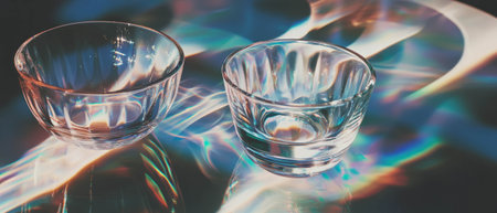 Elegant glass tableware displaying intricate shapes and shimmer on smooth surfaces