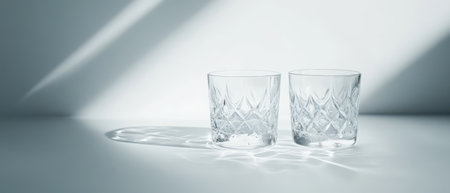 Two crystal glasses with intricate designs are placed on a surface casting delicate shadows as sunlight streams in.
