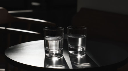 Glasses of water on a sleek table, the clear liquid reflecting the light and adding a sense of clarity and purity to the scene