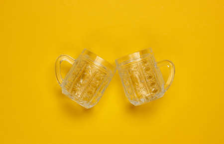 Two glasses on the gold background or yellow background in natural sunlight with shadows. Minimalist creative composition. Shadows.