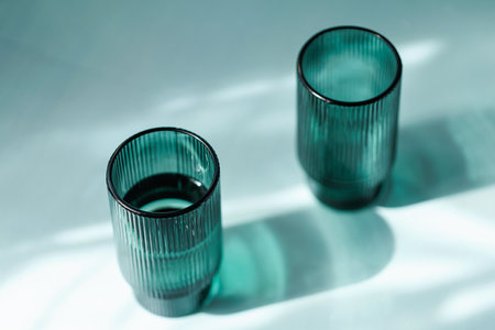 Two clear, empty glasses are positioned on a white surface, set against a soft teal background, creating a minimalist composition.