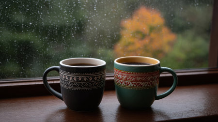 Two coffee mugs sit on a wooden window sill, with the backdrop of raindrops and vibrant autumn leaves, creating a cozy and inviting atmosphere for relaxation.